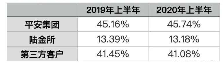 2020年上半年,金融壹賬通來自平安集團的營收為6.2億元,佔總收入比重由2019年同期45.16%上升至45.74%;來自陸金所的營收為1.8億元,佔總收入比重由2019年同期13.39%下降至13.18%;來自第三方客户的營收為5.57億元,佔總收入比重由2019年同期41.45%下降至41.08%。