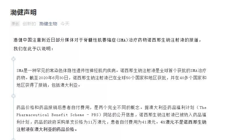 藥品價格和藥品報銷後患者自付費用,是兩個完全不同的概念。據澳大利亞藥品福利計劃(The Pharmaceutical Benefit Scheme-PBS)網站的公開信息,諾西那生鈉注射液已被納入藥品福利計劃,藥品的政府採購單支價格為11萬澳元,患者自付費用為41澳元。41澳元不是諾西那生鈉注射液在澳大利亞的藥品價格。
