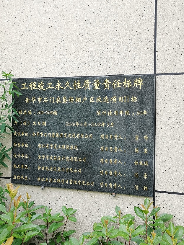 隨後,我就房屋質量驗收一事當面詢問市政府下派農場的工作組人員,得到的口頭答覆是“竣工時有立永久性質量責任標牌”。經入住職工多方尋找,終於在知青家園19號樓的隱蔽處發現這塊所謂的“永久責任標牌”(如圖)。職工們不解,上面所寫工程名稱怎麼是“10#——20#”,而非知青家園?
