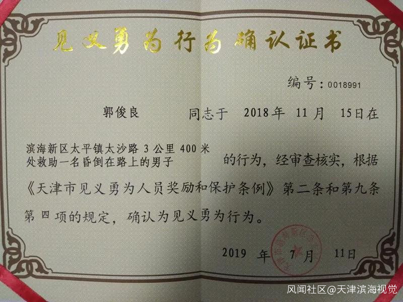 因為發現救治及時,老人脱離了危險,事後老人家屬通過多種渠道打聽到了郭師傅,並找到了927路車隊向郭師傅贈送錦旗表示感謝。這是郭俊良師傅第一次救人的故事,也正是因為這事,在2019年07月11日,濱海新區公安局向郭師傅頒發了第一張《見義勇為行為確認證書》。後來有媒體記者採訪時他曾經這樣説:我做的事兒可沒有多偉大,我就是能讓自己在晚上睡覺時能睡的好,睡的香。如果看見不救助的話,我一定會寢食難安的!這就是一個凡人從內心深處説出來的很有分量的實在話。
