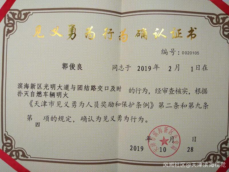 2019年10月28日,郭俊良師傅再一次拿到了濱海新區公安局為他頒發的《見義勇為行為確認證書》,而這一回卻源於一次遇險救火的故事。