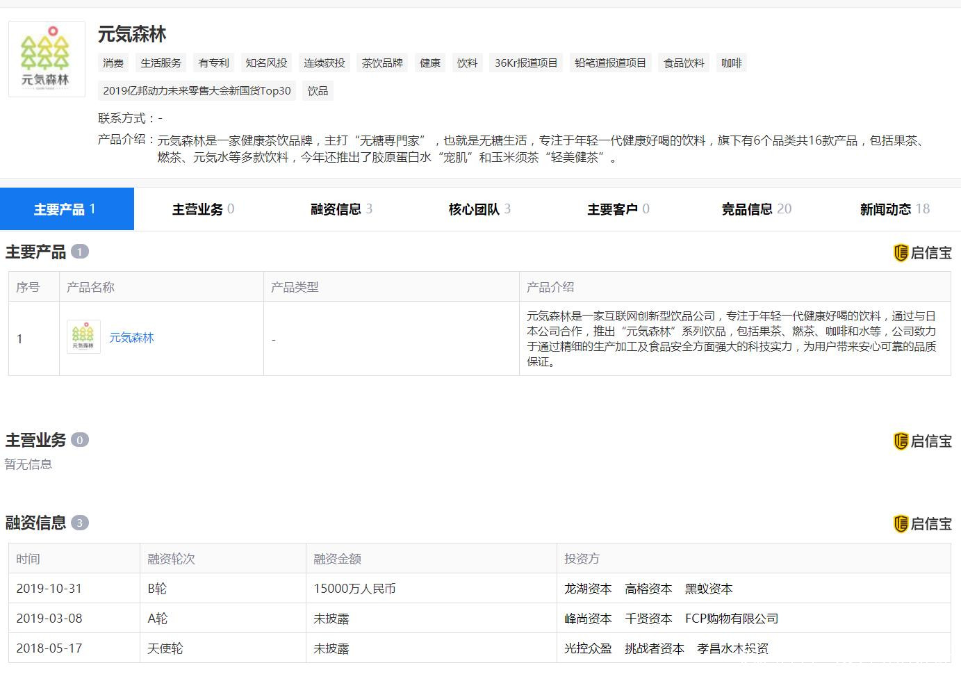 近些年,元氣森林在資本市場上備受青睞。天眼查顯示,2017年以來,元氣森林先後獲得來自挑戰者資本、共青城星創、千賢資本等8家機構投資的4輪融資。其中,2019年10月,元氣森林獲高榕資本、黑蟻資本、龍湖資本共計1.5億元的投資,估值為37.5億元。3年時間估值從0做到40億,元氣森林的成長速度驚人。不過,此前有媒體報道,元氣森林在2019年尚未實現盈利。