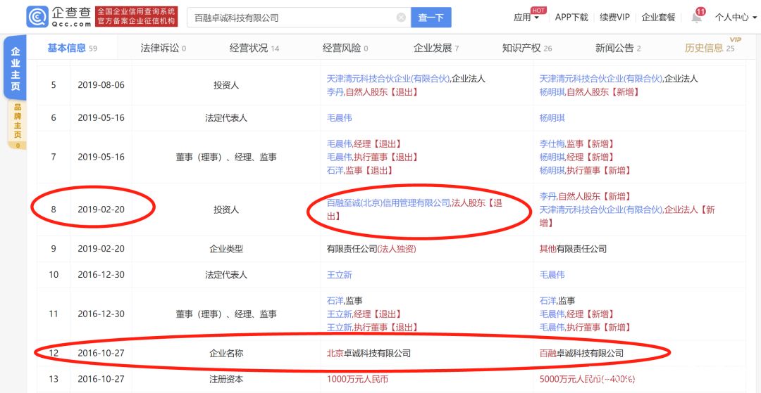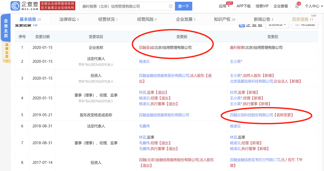 就在2019年4月24日,涉黑人員周純被限制居住之前,百融雲創在2月20日切割了與涉案公司百融卓誠科技有限公司的股權關係,即涉案公司原來的法人股東百融至誠(北京)信用管理有限公司退出了。隨後,該退出的公司更名為“鑫科智惠”。根據企查查,“鑫科智惠”直接參股去年底被山東警方立案偵查的濰坊百盾眾安和北京信雅樂達兩家涉黑暴力催收公司。