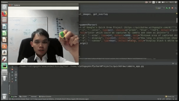 這是他用Python開發的一款在線小遊戲,你可以直接在攝像頭前畫一些簡筆畫,比如門、衣服、褲子等容易識別的物體,系統首先能夠識別出你在畫畫,其次能夠根據你隔空畫的輪廓識別出你畫的是什麼。