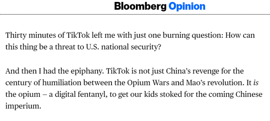 這篇文章宣稱,正在被美國政府以危害“國家安全”為名而懲治的中國企業“字節跳動”及其開發的“美國版抖音”應用TikTok,其所帶來的危害要比“危害美國國家安全”更嚴重,不僅是中國報復西方的“鴉片”,更彰顯了中國的“帝國主義野心”。