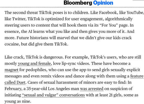 不過,這位學術背景“顯赫”的大教授,卻在他昨天發佈在彭博社網站上的一篇評論TikTok的文章中,展現出了比美國政客更為瘋狂和荒誕的觀點。