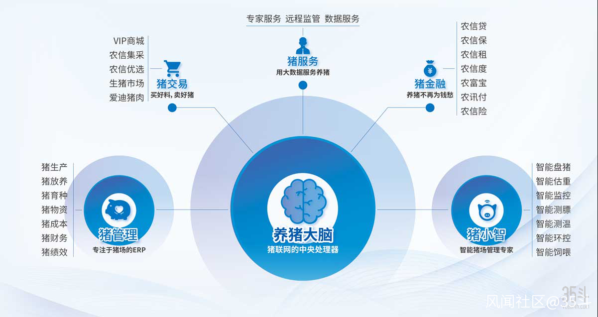 在數字技術與畜牧業深度融合應用方面,大北農持股並孵化的農信互聯以生豬交易為入口,主營以生豬線上撮合交易為切入點,圍繞生豬產業鏈鋪開,通過豬聯網形成以豬為核心的農信生態鏈。豬聯網,包括豬管理、豬小智、豬交易、豬金融、養豬大腦五大核心體系,開創“互聯網+”時代的智慧養豬新模式,目前管理生豬的數量為全國第一。目前服務生豬大約4000萬頭,2018年累計平台交易額大約500多億。