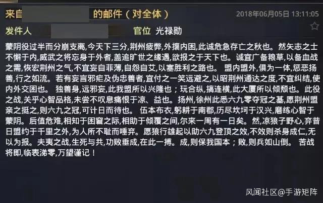 落回到《率土之濱》遊戲中也是如此,越強大的同盟勢力越需要天下歸心,檄文對內鼓舞士氣、對外孤立對手的作用則更加凸顯。以655區的經典檄文為例,在荊州與涼州雙方戰爭陷入僵持的背景下,荊州勢力突然發佈了一篇討賊檄文。這篇檄文講述了荊涼二州本為盟友,但涼州野心膨脹,單方面撕毀盟約、導致大量荊州玩家土地淪陷的情況,列舉了涼州背信棄義的種種罪狀,表達了對各位盟友奮勇抗敵、共赴國難的勉勵。