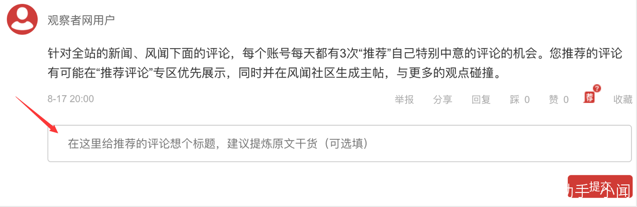 針對全站的新聞、風聞帖文下面的評論,每個賬號每天都有3次“推薦”自己特別中意的評論的機會。您推薦的評論有可能在“推薦評論”專區優先展示,同時並在風聞社區生成主帖,與更多的觀點碰撞。