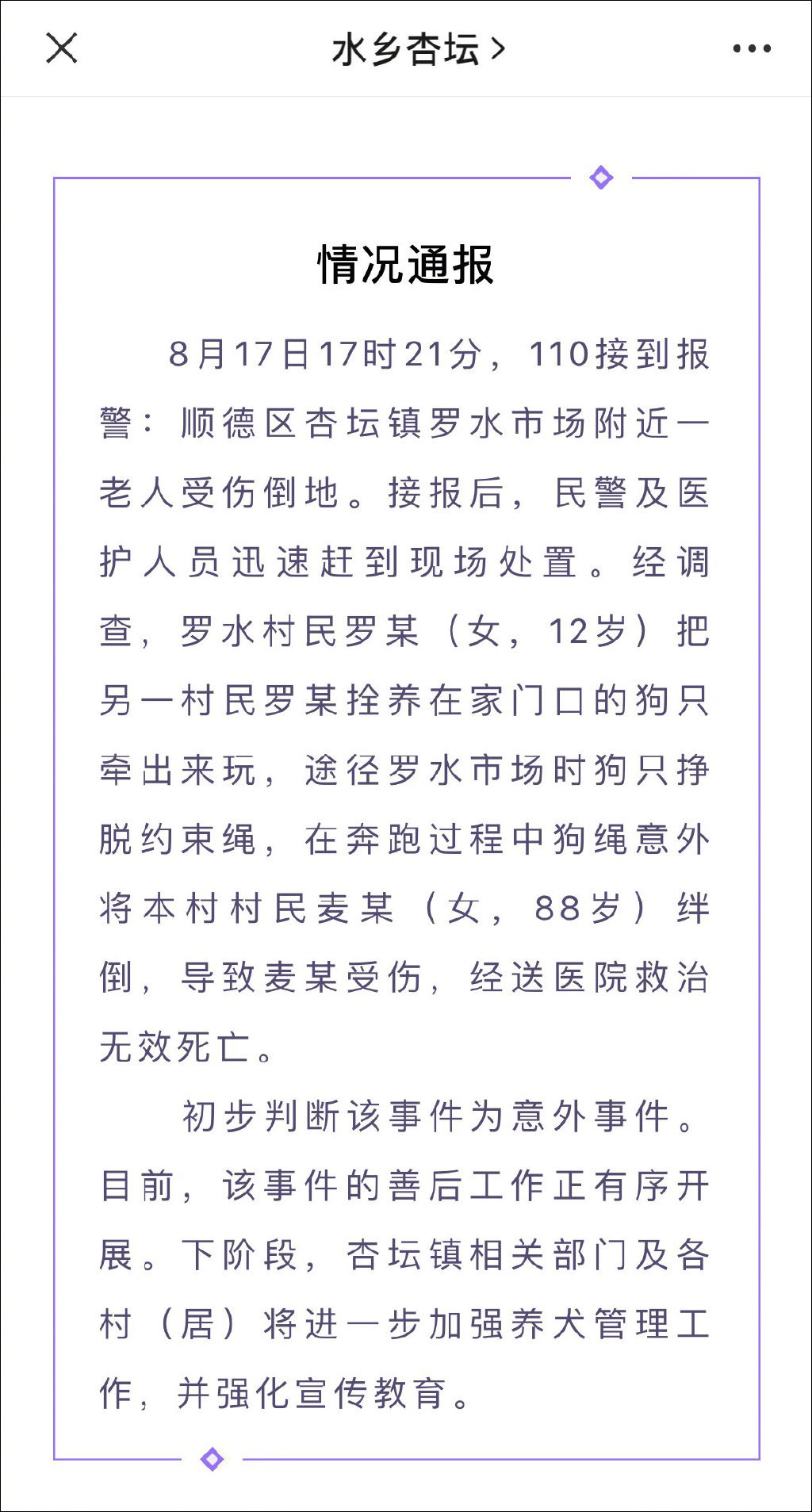8月17日17時21分,110接到報警:順德區杏壇鎮羅水市場附近一老人受傷倒地。接報後,民警及醫護人員迅速趕到現場處置。經調查,羅水村民羅某(女,12歲)把另一村民羅某拴養在家門口的狗只牽出來玩,途徑羅水市場時狗只掙脱約束繩,在奔跑過程中狗繩意外將本村村民麥某(女,88歲)絆倒,導致麥某受傷,經送醫院救治無效死亡。初步判斷該事件為意外事件。