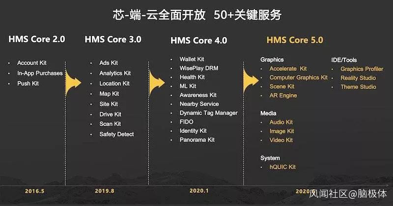 實際上,從2016年到2019年間,HMS一直都在,但只有最基本的帳號、支付和推送服務。直到被列入實體清單,HMS 4.0用數月時間完成了海外開發者需要的基礎功能建構,而在前不久發佈的HMS Core 5.0中,獨屬於華為的特色開始被釋放出來,從芯片端、終端應用以至雲服務一體的“芯、端、雲”支撐體系被融入到了移動服務生態之中。