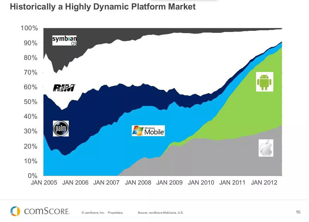 前面説到,微軟在移動生態中延續了工業時代的思路,對手機製造商收取高昂的授權費,每台 Windows Phone 大約25 美元。蘋果也選擇了閉源的方式。這就給了安卓迅速搶佔移動操作市場天下的機會。