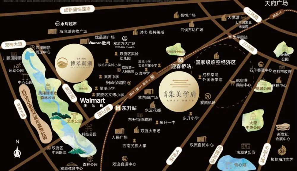 比如在地理位置上,博翠粼湖正對着8500畝城市濕地公園,毗鄰鳳翔湖,推窗便是園景湖景。交通層面,“三橫三縱一地鐵”,半小時基本能無縫對接成都核心區域。