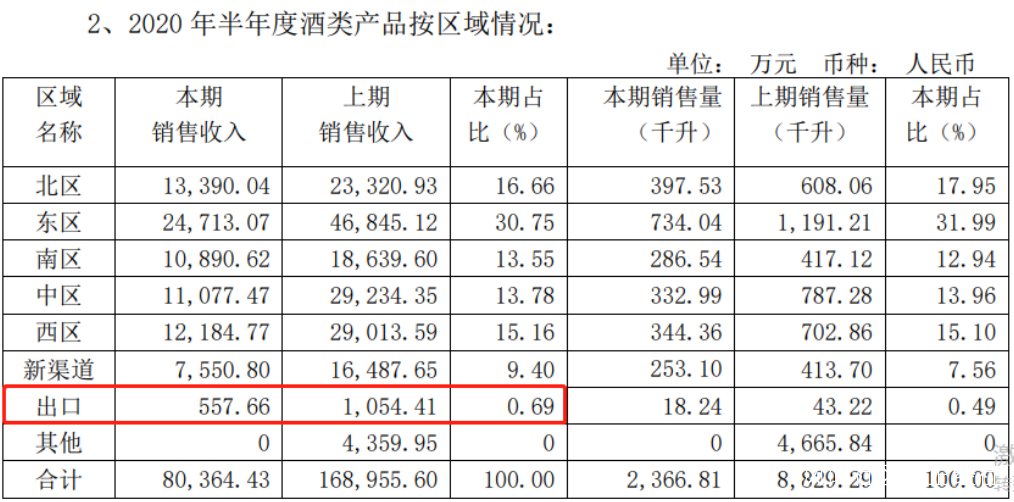數據顯示,2019年水井坊總營收35.39億元,海外營收為2451.62萬元,佔比約為6.9%;2020年上半年營收8.04億元,海外營收僅有557.66萬元,佔比僅為0.69%,出口量微乎其微。
