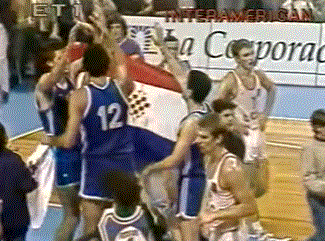 社會上的這種變故,也蔓延到了籃球賽場上。在1990年的世錦賽觀眾席上,到處可見一面有着格子盾牌的紅藍白三色旗,這就是還沒有獨立的克羅地亞“國旗”。