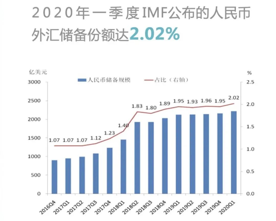 得益於一帶一路,人民幣國際化在近年來確實提速不少,2020年一季度IMF的人民幣外匯儲備份額達到了2.02%。