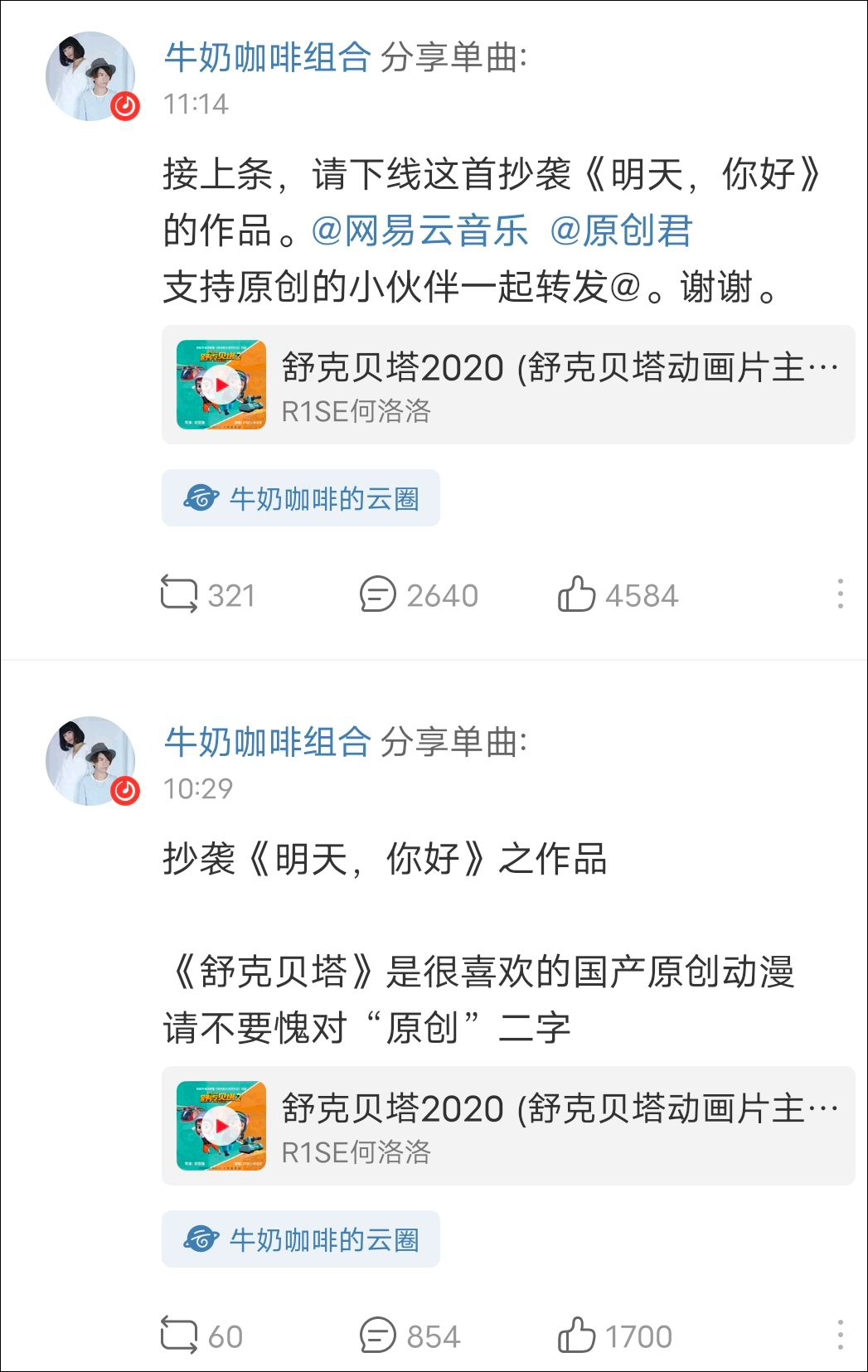 牛奶咖啡的粉絲緊追不捨,直言尊重版權和原創是最基本的素養,抄襲歌曲涉及到的各個方面都難逃關係。該粉絲還點名了演唱者何洛洛、《舒克貝塔》官方賬號和作曲人@劉佳,要求正面回應。