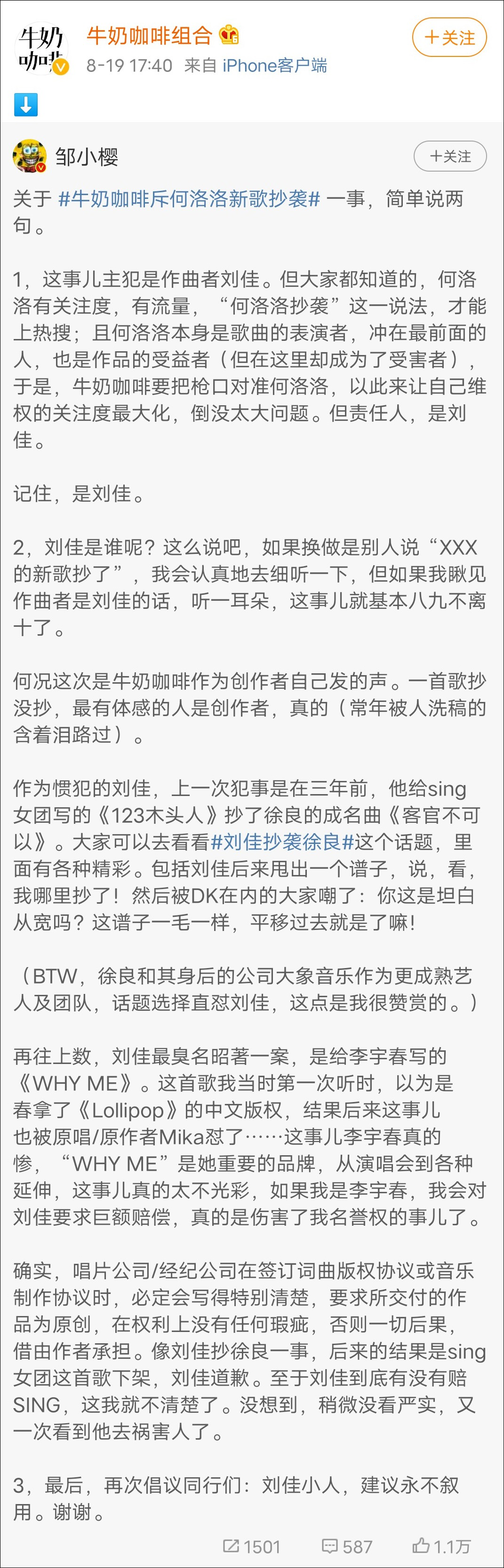 何洛洛的粉絲急忙發聲辯解,抄襲確實是不對的。但是何洛洛只是演唱者,牛奶咖啡應該把重點放在抄襲者(作詞、作曲等)身上。牛奶咖啡則回懟:你們的偶像唱了一首抄襲的作品。