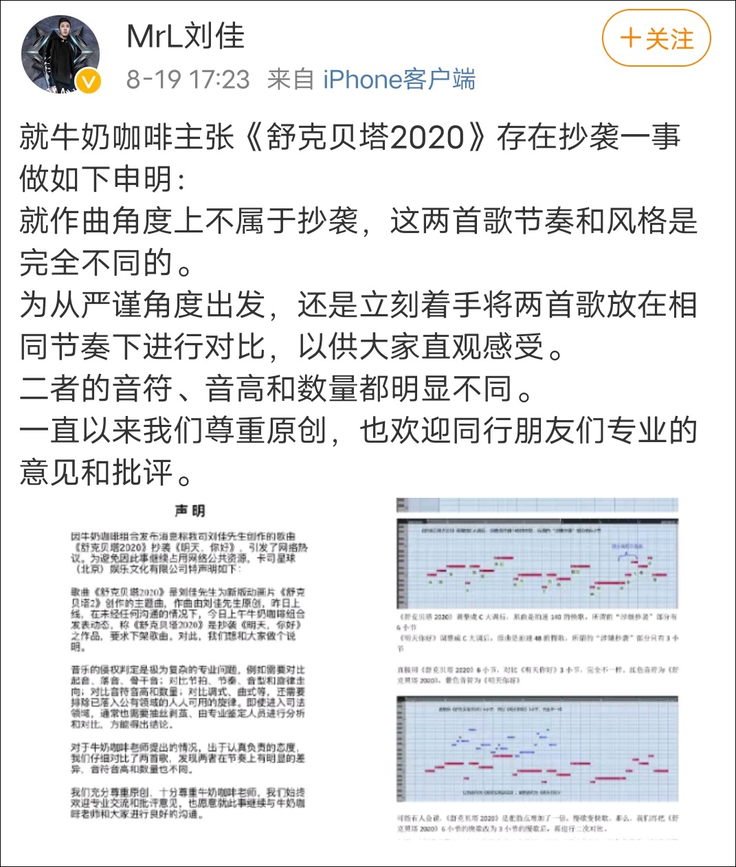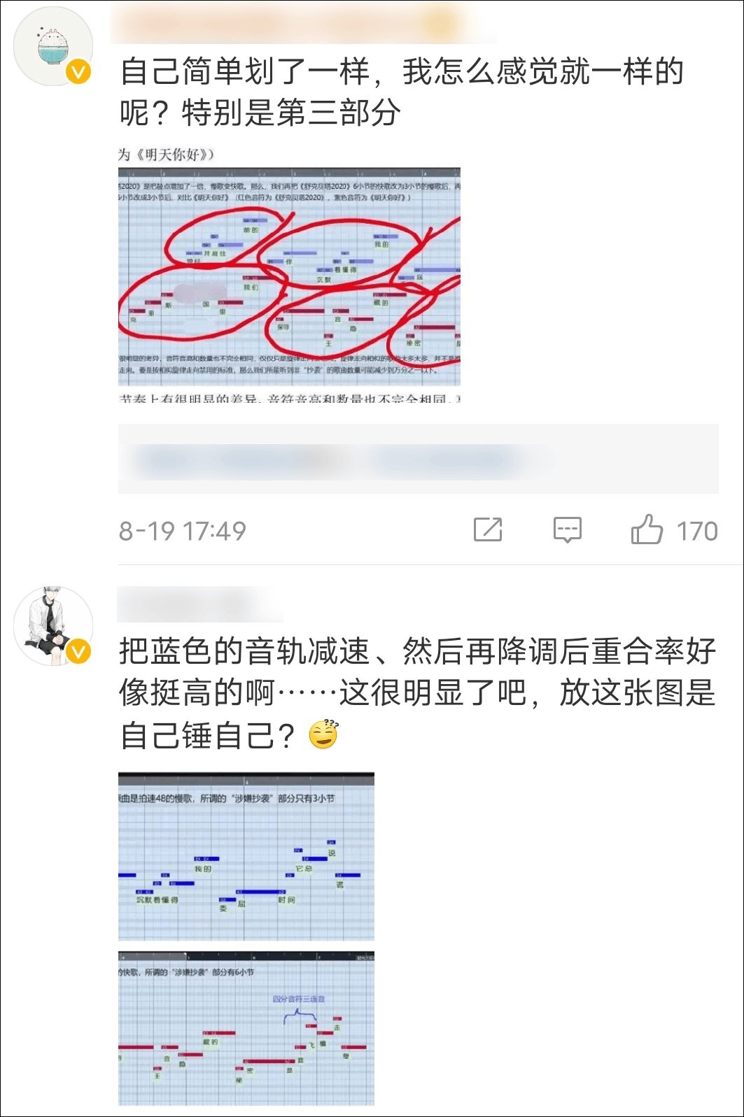 作曲人@劉佳迅速發佈聲明,並提供了兩首歌的對比數據,以此為證據聲明自己沒有抄襲:
