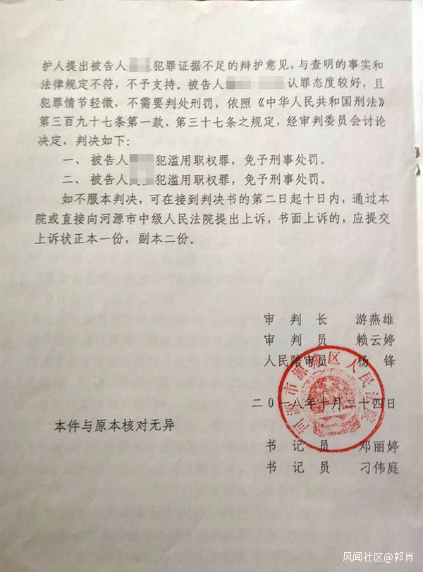 2018年10月,源城區法院對當事兩協警作出一審判決,認為賴某、吳某在代表執法機關查處違法車輛時,超越職權,造成一人死亡、一人一級傷殘的嚴重後果,其行為已構成濫用職權罪。因賴某、吳某認罪態度較好,情節輕微,不需要判處刑罰,遂判賴某、吳某犯濫用職權罪,免於刑事處罰。