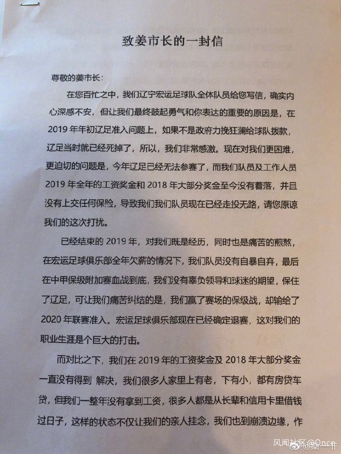 遼足球員致信紀委、市長討薪:球隊解散後大部分工資及獎金沒有着落_風聞