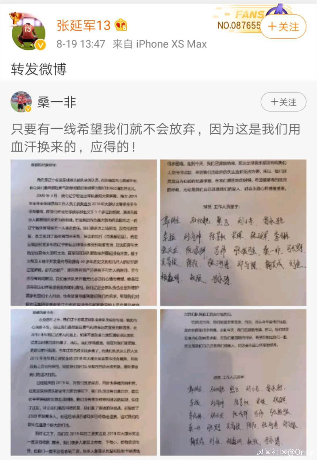 “只要有一線希望我們就不會放棄,因為這是我們用血汗換來的,應得的!”前遼足球員桑一非在自己最新發布的討薪微博中寫道。