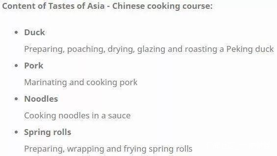 其實,在這之前,倫敦的藍帶廚師學院就有中餐課程。六個小時的授課時間裏,學員們將學習如何製作北京烤鴨,麪條,醃製豬肉和春捲…