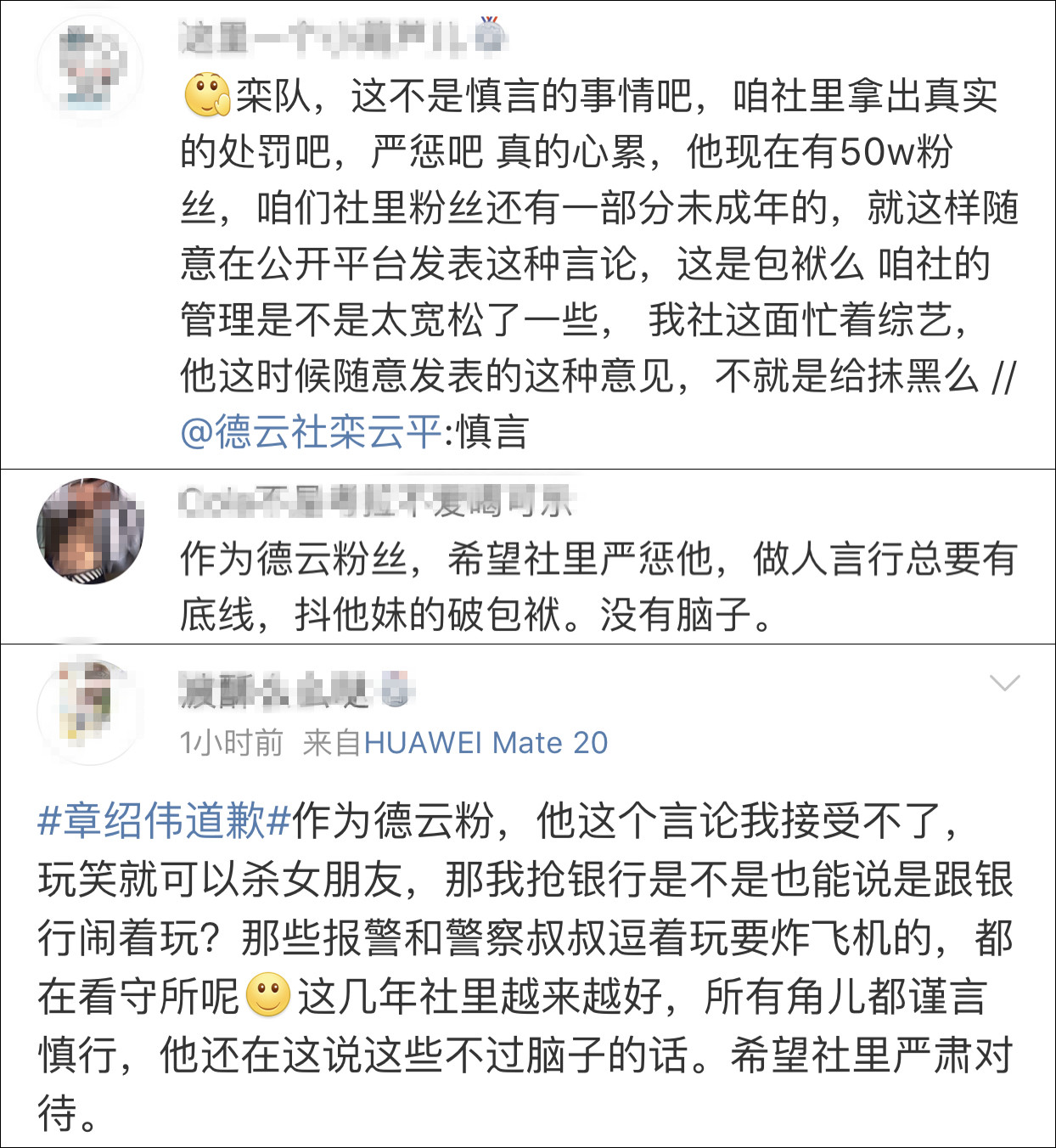 截至發稿前,德雲社官方還未就此事發表聲明。演出一隊的隊長欒雲平則在章紹偉的致歉博文下留言,“慎言”。
