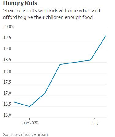 △美國人口普查局數據顯示,負擔不起給孩子提供足夠食物的美國家長比例持續上升,7月底已經接近20%。