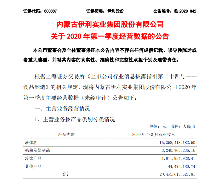 早在2020年3月26日,蒙牛乳業就發佈公告稱,由於部分產品運輸線路受到限制,售點運作和產品週轉受到較大影響,從而影響2020年2月至3月的銷售,以及上下游全供應鏈的正常運作,對2020年上半年度的銷售及財務表現產生不利影響。