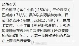 廢話不多説了,流感疫苗已經在某些地區到貨了。本來,流感疫苗的接種季一般是從當年的8月中下旬到次年的春節後,現在是疫情期間,事情就很不一樣。有同行發給我這樣一個微信羣通知:上級要求流感疫苗在9月份完成接種。