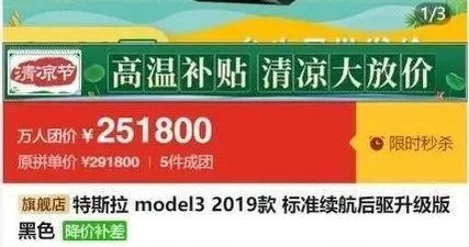 7月20日,拼多多平台的宜買車旗艦店推出了一個特斯拉model 3的萬人團活動,原價291800的Model3,參與萬人團活動可以獲得兩萬的補貼,再加上2萬的國家新能源車補,最終價格只需要251800元。