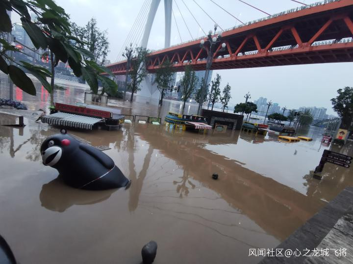 “因為小熊固定得很牢固,我們在洪水來臨前巡邏時,還將阻擋行人的警戒線繫到了熊的肚子上,沒想到最後連熊帶繩都被沖走了。”李女士回憶,19日白天,洪水漫過龍門浩老街,熊本熊雕塑被洪水沖走,隨波逐流往下游漂去,由於忙着抗洪搶險,他們還不知道小熊漂到了哪裏,“直到今天看到網上的照片,我們才知道它漂到了慈雲寺。”