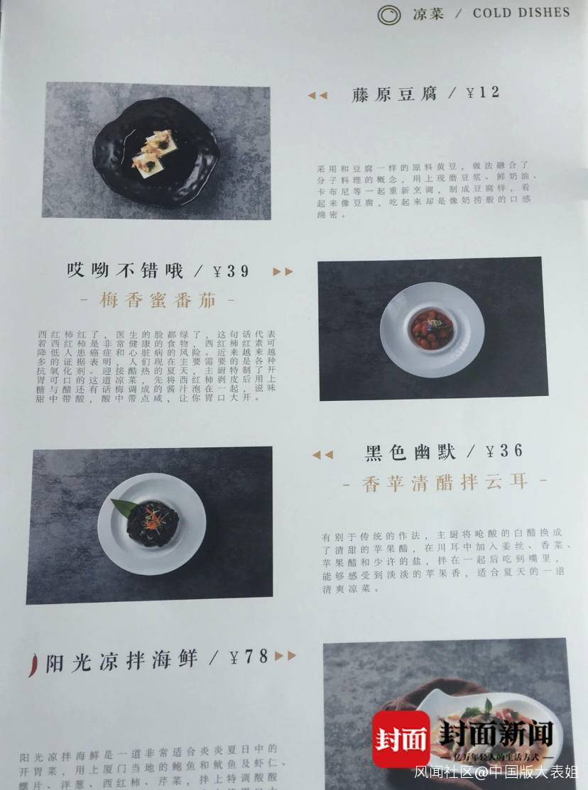 8月20日,記者在某點餐類平台看見,這家叫做J大俠中華料理餐廳的店鋪內菜品大多都以周杰倫歌曲命名,在餐廳的涼菜菜單中,幾道涼菜分別取名“哎喲不錯喲”“黑色幽默”“藤原豆腐”。