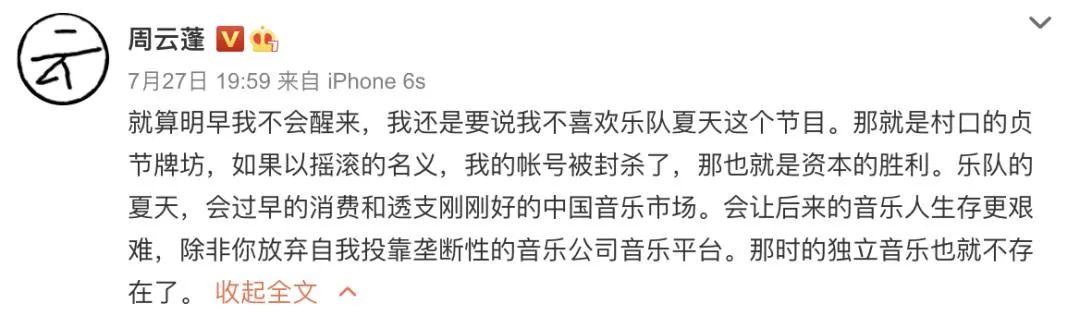 “《樂隊的夏天》會過早地消費和透支剛剛好的中國音樂市場,會讓後來的音樂人生存更艱難。”民謠歌手周雲蓬在第一季節目播出之初,連發11條微博,質疑音樂綜藝節目會讓資本湧入音樂市場,消耗好不容易建立起來的中國音樂圈生態,讓真正的獨立音樂人的未來變得更艱難。