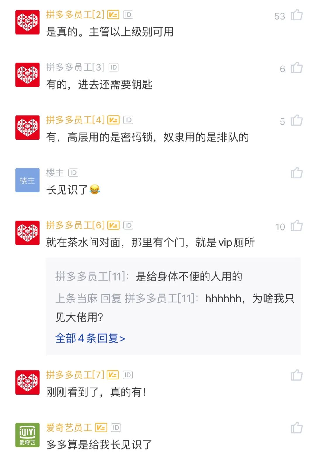 比起“上廁所難”,還有認證為拼多多員工的網友爆料稱拼多多有“VIP廁所”。據網友,所謂“VIP廁所”就是隻供主管以上級別員工使用,設有密碼鎖,普通員工沒有鑰匙或者門卡無法進入。