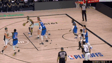 同時由於芬尼-史密斯前兩場的三分表現並不好,如果他外彈,祖巴茨會完全放空他,退到禁區裏。而一旦東契奇持球進入禁區,祖巴茨立馬又會貼上去,用身高臂展干擾他。事實上,這裏已經形成了換防,但在禁區的狹小空間裏,東契奇想要懲罰祖巴茨並不容易。