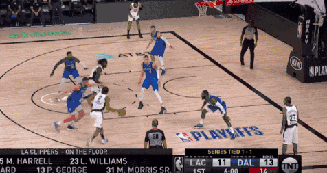 於是他會選擇把祖巴茨拉到外線,試圖利用更廣闊的空間單打祖巴茨。在這個過程之中,快船會讓原本處於弱側的防守人和祖巴茨形成一個換防,因為快船首發除了祖巴茨都能換防東契奇,於是一次完整的防守就完成了。