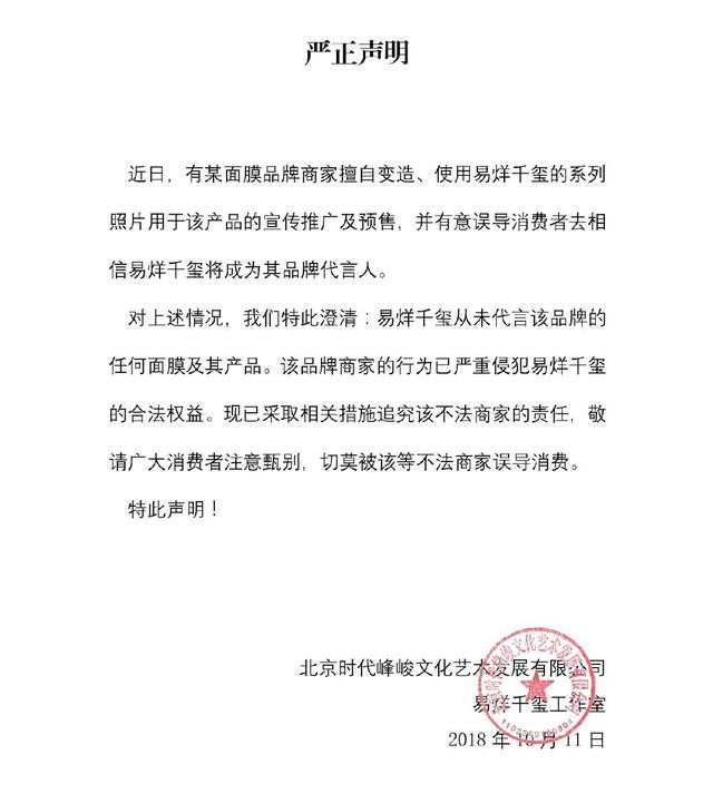 2018年10月,化妝品公司在天貓旗艦上放出一張剪影照並稱“猜猜新代言人是誰”。粉絲很快猜出該剪影是易烊千璽。但是10月11日和12日,易烊千璽工作室連發兩條聲明表示從未簽訂代言協議。