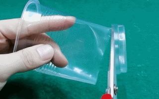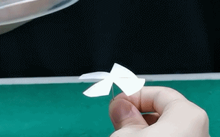 我們的用手掌將塑料杯握住,手掌通過杯子將熱量傳遞給空氣,眾所周知,熱空氣受浮力會向上流動。此時,流動的空氣會對彎折過的紙葉片產生一個力矩,使得紙葉片開始旋轉,就像是一個“逆向”的電風扇。