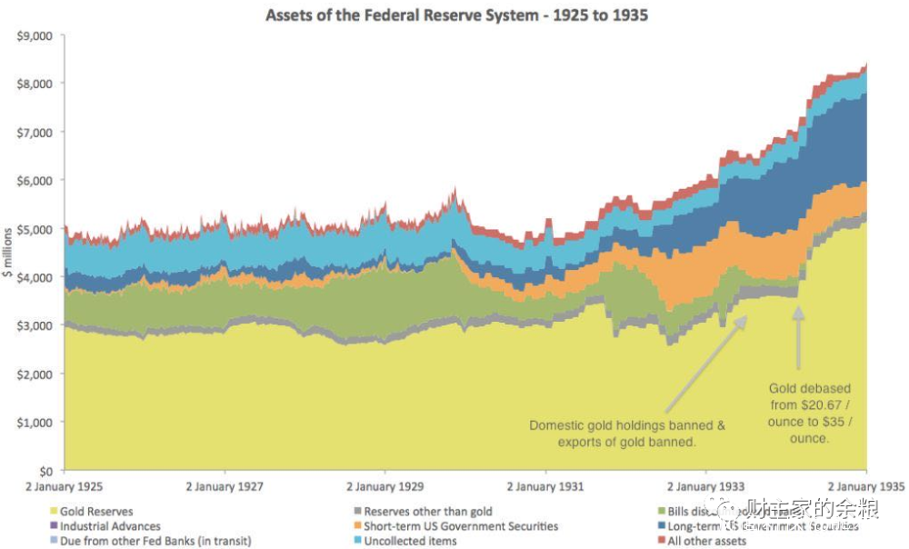 圖例説明:最下面的黃色圖例為黃金,其上的棕色為貼現票據和貸款,橙色為短期國債,藍色為長期國債,青色條目為待收款項,暗紅色條目為其他資產,下同。
