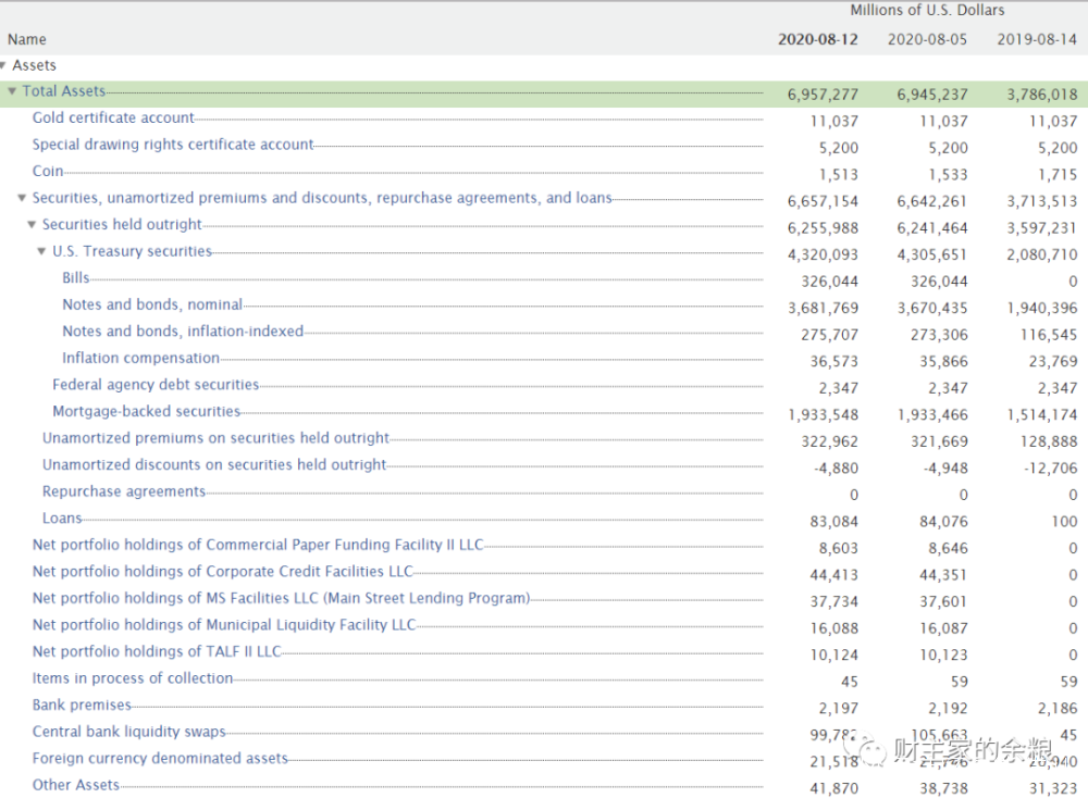 下面的這個表格,就是最新的美聯儲資產負債表中的資產構成。