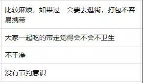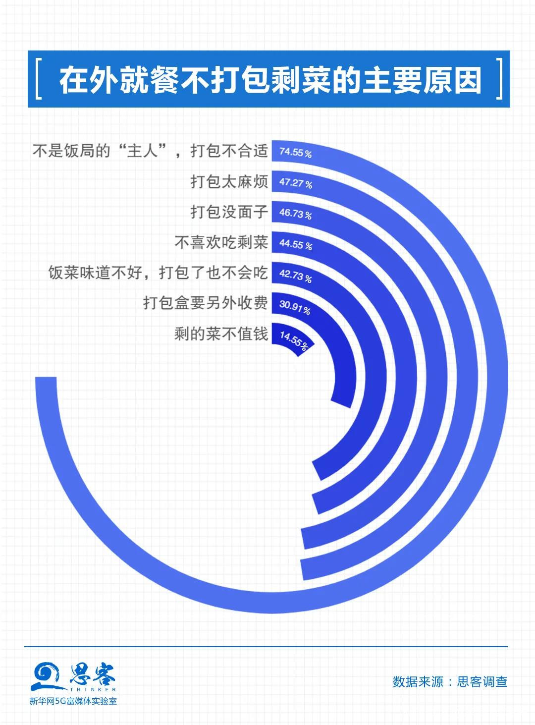 打包不合適、太麻煩、沒面子,這些是受訪者認為在外就餐不願打包剩菜的主要原因。“我不是宴會的主辦者,我打包不合適,好像我佔便宜似的”“同桌的人一起夾過的菜,打包不衞生”“穿着西裝打着領帶,手上拿着打包盒很奇怪”“中午食堂的剩菜又沒有打包盒裝,下午又沒地方放,沒人會打包帶走”,這樣的受訪者留言在後台還有不少。
