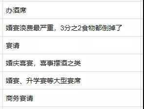 在調查問卷的後台留言中,不少受訪者留言説,同學會、紅白宴、生日宴、升學宴、商務宴請等浪費量較高,甚至有人説“三分之二的食物都倒掉了”。