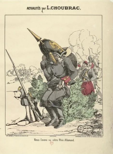 1870年的法國已有半個世紀未與德國交手,在對對手的無知與帝國的自負中開始滋生出一種想象,法蘭西第二帝國逐漸將自己的對手建構成愚蠢、懦弱的他者,而以拿破崙三世為代表的帝國主義者急於復仇,這一情緒更是成為這種想象的養料。恩格斯觀察到,普法戰爭激起了德意志人的民族感情。眾志成城會給德國人帶來強大的力量,而法國人顯然對此一無所知。在交戰信息傳來之前,巴黎出現的大批漫畫均諷刺德國人不堪一擊,並形成固定的“套式”,以此開始構建出法國人必勝的幻象。