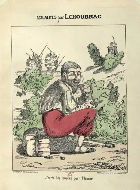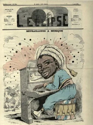 值得注意的是,許多法國漫畫甚至選用黑人作為己方的英雄形象。殖民地士兵成為法國正規軍的歷史可追溯至拿破崙時代,其主要作為小規模戰鬥的輕型步兵。阿爾及利亞土著步兵從克里米亞戰爭開始就在法國參與的大規模軍事行動中扮演起重要角色。對於這支軍隊,德國人自然是以膚色與種族為由對其肆意嘲笑,但他們作為法國士兵的一員,則成為法國人加以歌頌的對象。8月7日的《月蝕報》封面刊登了一幅描繪阿爾及利亞步兵的漫畫,名為《機槍音樂》。畫中有一個得意的黑人在彈鋼琴,背後則是飛出的子彈與應聲倒下的敵人。不過,在此時法國人的意識中土著步兵並非完全與法國正規軍等同,夏姆的漫畫《巴登》將土著步兵與德國的巴登士兵放在一起,即是意味着土著步兵在法軍中的地位與巴登士兵在普軍中的地位相同。就連土著步兵都打不過的普軍,自然只是一支弱旅,法國人自會輕鬆贏得戰爭的勝利。
