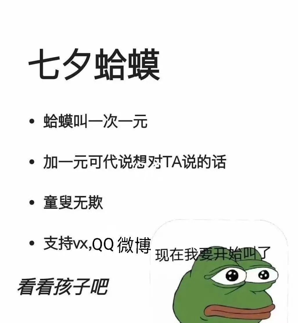 網上七夕蛤蟆的業務開展的如火如荼,競爭激烈,價格從5塊到2塊,再到1塊,五毛…服務從普通版到VIP,再到超級VIP。。(也不知道蛤蟆叫還能叫出什麼樣的豪華VIP。。。)