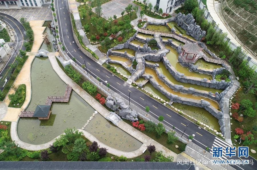 鎮安縣鎮安中學多級瀑布羣與水池棧道涼亭景觀(7月30日攝,無人機照片)。圖片來源:新華社