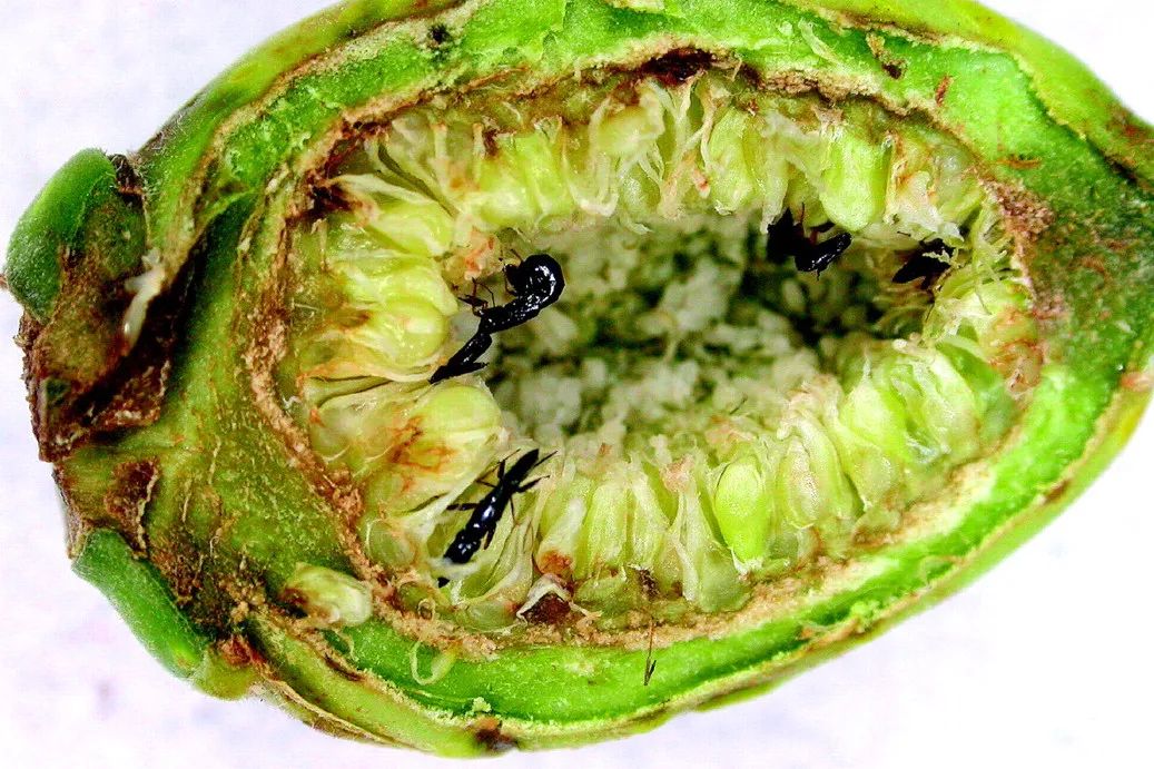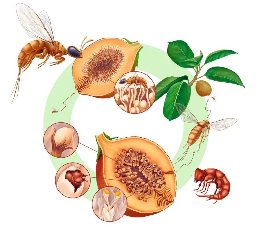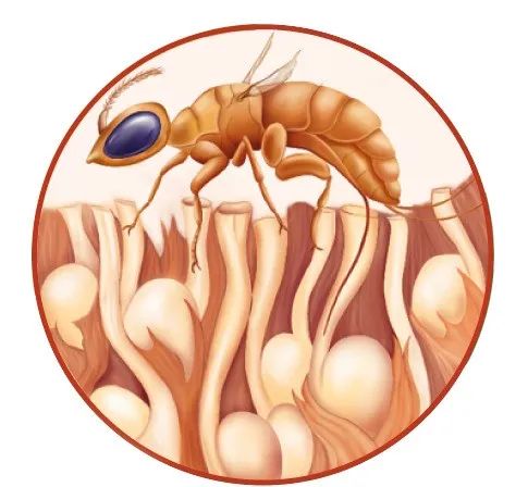 雌蜂在無花果果實內尋找着花朵,同時蹭着蹭着幫無花果傳了粉。找到花朵後,雌蜂便將產卵針沿着花柱刺入子房中產卵,如果它的受精卵在子房中安家,這朵花便發育成為“蟲癭”,將幼蜂包裹住保護起來。而如果蜂卵沒能到達子房,雌花授粉後會發育成為無花果種子。