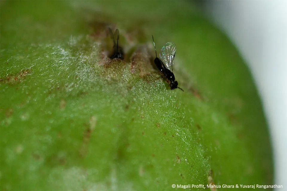 幼蜂所在的子房形成了蟲癭,待幼蜂長大,它們就會從這個植物提供的保護殼裏爬出來。通常雄蜂會先出生,探索這個狹小的空間。這雄蜂便是第二位家長。